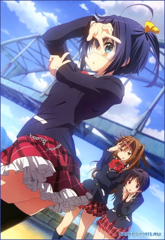 Описание: Кто из нас не предавался юношеским грезам, воображая себя могучим магом, прекрасной принцессой, темным эльфом или светлым рыцарем? У кого-то иллюзии проходят вовремя, у кого-то принимают запущенную форму, доставляя серьезные проблемы автору и окружающим. Юта Тогаси перед поступлением в старшую школу окончательно пришел в себя, вынес из дома пластиковый меч, прочую мишуру и твердо решил двинуться дорогой взрослой сознательной жизни. Но как прикажете понимать новую соседку и одноклассницу Рикку Таканаси, что прячет под повязкой «дурной глаз» и не дает бедному Юте проходу, поскольку он «собрат по вере», а «темные» должны держаться друг друга?! Конечно, приятно, когда к тебе липнет симпатичная девчонка, но в классе есть и другие красотки, с кем можно поговорить не только о черной магии, но и, кхм… о разном. Вот только милашка Рикка уже запала в душу и не отпускает, так и хочется иногда развернуть плечи во всю богатырскую мощь и крикнуть врагам: «Да сгиньте в темном пламени!» Впрочем, общение с другими школьницами показало главному герою, что прекрасный пол вообще любит веселых и интересных парней, даже если тщательно скрывает это, как красавица-староста Синка Нибутани. Короче, Юта, не торопись становиться скучным – настоящий мужчина одинаково хорош и в пределах реального мира, и на просторах Страны Фантазии! Адаптация серии ранобэ (коротких романов с иллюстрациями).