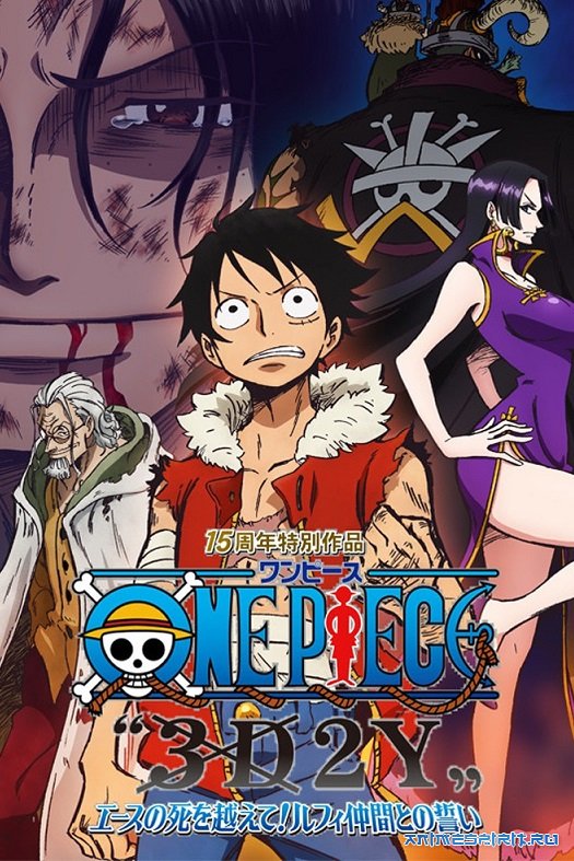 Описание: One Piece 3D2Y — спецвыпуск, посвященный к пятнадцатилетию сериала «Ван-Пис»! В спецвыпуске рассказывается о приключении, которое случилось во время двухлетней тренировки Луффи с Сильверсом Рэйли. Главным злодеем спецвыпуска выступает Бёрнди Ворлд. Ворлд — опасный пират, владеющий не только силой Дьявольского плода Больше-Больше, но и Волей. Вместе с Боа Хэнкок Луффи придётся выступить против него, чтобы не нарушить клятву, данную своим соратникам!
