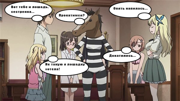 Доброго времени всем. Пришли оценки Gasa Грамотность:Ошибок не обнаружено. 3 балла из 3-х.Логичность: Эта шутка в данном контексте несколько не вяжется с изображением. Если учесть, что на изображении лошадь и шутка говорит о коне, то должно быть логично, но в контексте картинки не хватает изюминки, позволяющей целиком воспринимать текст и изображение. 2 балла из 3-х.Оригинальность: Редко встретишь научный юмор в сочетании с аниме, но "сферический конь в вакууме" довольно известен. 2 балла из 3-х. 7 баллов. Alex MorioГрамотность: Замечаний нет. 3 балла из 3-х.Логичность: Вполне можно предположить, что героиня с головой лошади проиграла спор, но меня немного смущает что здесь замешаны родители. Из-за этого потерялся эффект, на мой взгляд, или не хватило какого-то ответа от "лошади". 2 балла из 3-х.Оригинальность: Спор - дело обычное, и в нем могут участвовать разные люди. Лично мне уже встречались шутки про спор родителей. 1 балл из 3-х. 6 баллов. zajchikГрамотность: Замечаний нет. 3 балла из 3-х.Логичность: Изображение и текст едины. Нет и мысли о том, чтобы рассматривать их по отдельности. Воспринимается легко, и даже остринка иронии есть. 3 балла из 3-х.Оригинальность:Работа заставила улыбнуться. Текст лег идеально и неожиданно, поэтому в категории "оригинальности" достоин высшего балла. 3 балла из 3-х. 9 баллов. МонтировкаГрамотность: Желтый текст прочитать не легко, но мне все-таки удалось найти ошибку. "Депрессанты" пишется с двумя "с". Не хватает пробела после одной из запятых. 2 балла из 3-х.Логичность: Не ясно, для чего было перечисление всего, что было. Текст не имеет кульминации, которая бы объяснила это. Поэтому изображение и перечисление смотрятся раздельно. 2 балла из 3-х.Оригинальность: Вредные вещества, наркотики - это все не ново. В последнее время в качестве шуток их используют редко, но это не добавляет оригинальности. 1 балл из 3-х. 5 баллов. ТОКЕТСУГрамотность:Одна точка после вопросительного знака лишняя и не хватает запятой после "по ходу". 2 балла из 3-х.Логичность: Попытка продать лошадь очень хорошо легла на изображение. 3 балла из 3-х.Оригинальность: Продать такую лошадь - хорошая идея, но в ней не хватает яркой кульминации. 2 балла из 3-х. 7 баллов. irGaГрамотность: Кроме отсутствующей точки, замечаний нет, но за нее баллы не снимаю. 3 балла из 3-х.Логичность: Хороший подход к картинке. Текст гармонирует с изображением. Дети угадывают, в кого оделась "воспитательница", но слишком много вариантов, из-за этого восприятие "композиции" затрудняется. 2 балла из 3-х.Оригинальность: Некоторые варианты угадывания показались забавными и в сочетании с изображением оригинальными, но другая часть произвела другой эффект, поэтому такая оценка. 2 балл из 3-х. 7 баллов. NyahaboykaГрамотность:Все в порядке. 3 балла из 3-х.Логичность: Обсуждение нового костюма выглядит логично, текст хорошо сочетается с изображением и воспринимается целостно. 3 балла из 3-х.Оригинальность: Оргинальность присутствует, но лишь в отдельных репликах , целостная тема крутится вокруг обсуждения костюма. 2 балл из 3-х. 8 баллов. ElofrinГрамотность: Замечаний нет. 3 балл из 3-х.Логичность:На мой взгляд, часть текста не нужна. Речи двух крайних персонажей справа портят все. Из-за них у читателя нет возможности подумать и посмеяться, почему девушка одела этот костюм. 2 балла из 3-х.Оригинальность:Из-за тех же двух реплик оригинальн