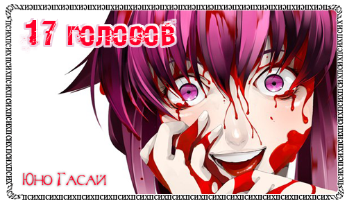 Понимаешь, тут вопрос спорный об определении слова псих  . Лично я, всего двух персонажей признаю, как Псих Юно Гасай (Yuno Gasai) - Дневник будущего (Mirai Nikki) Джузо Судзуя (Juuzou Suzuya)- Токийский гуль (Tokyo Ghoul)А вот кому-то Изая, кажется психом. Он не кровожадный, но маниакально влюбленный в людей. Это своего рода тоже можно притянуть за уши, как психическое расстройство  .