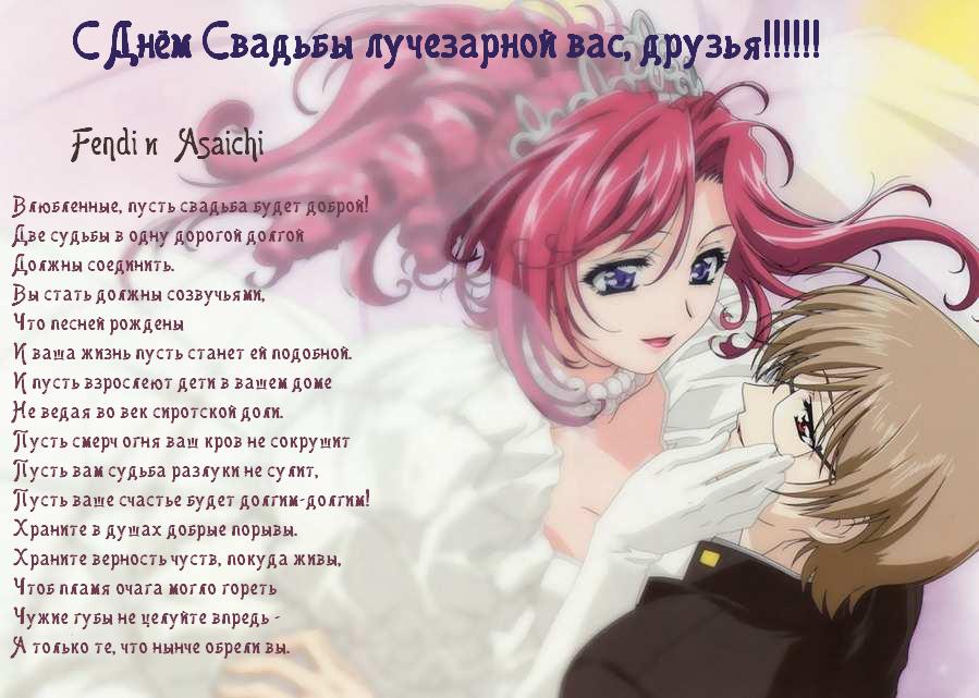 Примите этот поздравок От всей души — писал, как мог! С Днем свадьбы я вас поздравляю, Веселой жизни вам желаю. Желаю, чтоб тебя жена В стрип-бар пускала, а сама, Готовила и, все убрав, Тебя ждала в одних чулках. Жене желаю, чтобы муж, Купив ей платье, шубу, тушь, Не пожалев своих наличных, Ей оплатил еще девичник. Живите долго и красиво, Успешно, дружно и счастливо! Сообщение отредактировал Tora Moriko - 8 декабря 2011 01:52
