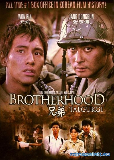 Описание: Южная Корея, 1950 год. Гражданская война безжалостными жерновами перемалывает человеческие судьбы. Вчерашние студенты – трясущиеся от страха юнцы – сегодня с винтовкой наперевес защищают непонятные идеалы, проливая кровь и расставаясь с жизнями. Под пресс военной машины попали и братья Жин-Тэ и Жин-Сок, поклявшиеся пройти это испытание плечом к плечу, под свист пуль и град осколков, сохраняя верность мальчишеским мечтам, чтобы однажды снова вернуться под родительский кров. Но кровавые подвиги Жин-Тэ отдаляют родственников друг от друга... Чан Дон Гон /Jang Dong-gun/, Цой Мин Сик /Min-sik Choi/, Вон Бин /Won Bin/, Ли Юн Чи /Eun-ju Lee/, Конг Хьёнг Чин /Hyeong-jin Kong/, Ли Ёнь Ран /Yeong-ran Lee/ Релиз добавлен по заказу Makeewa.Marina